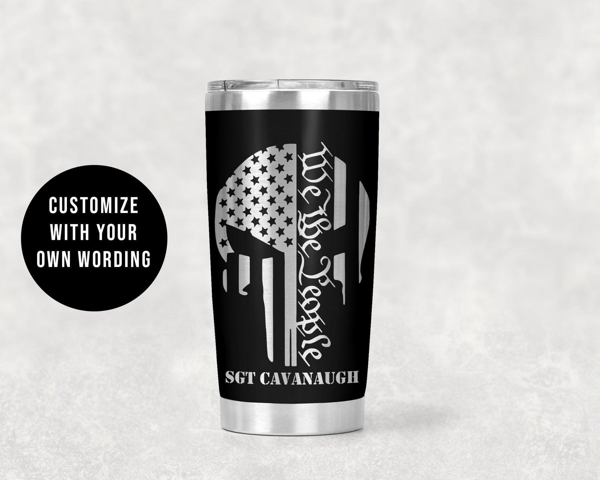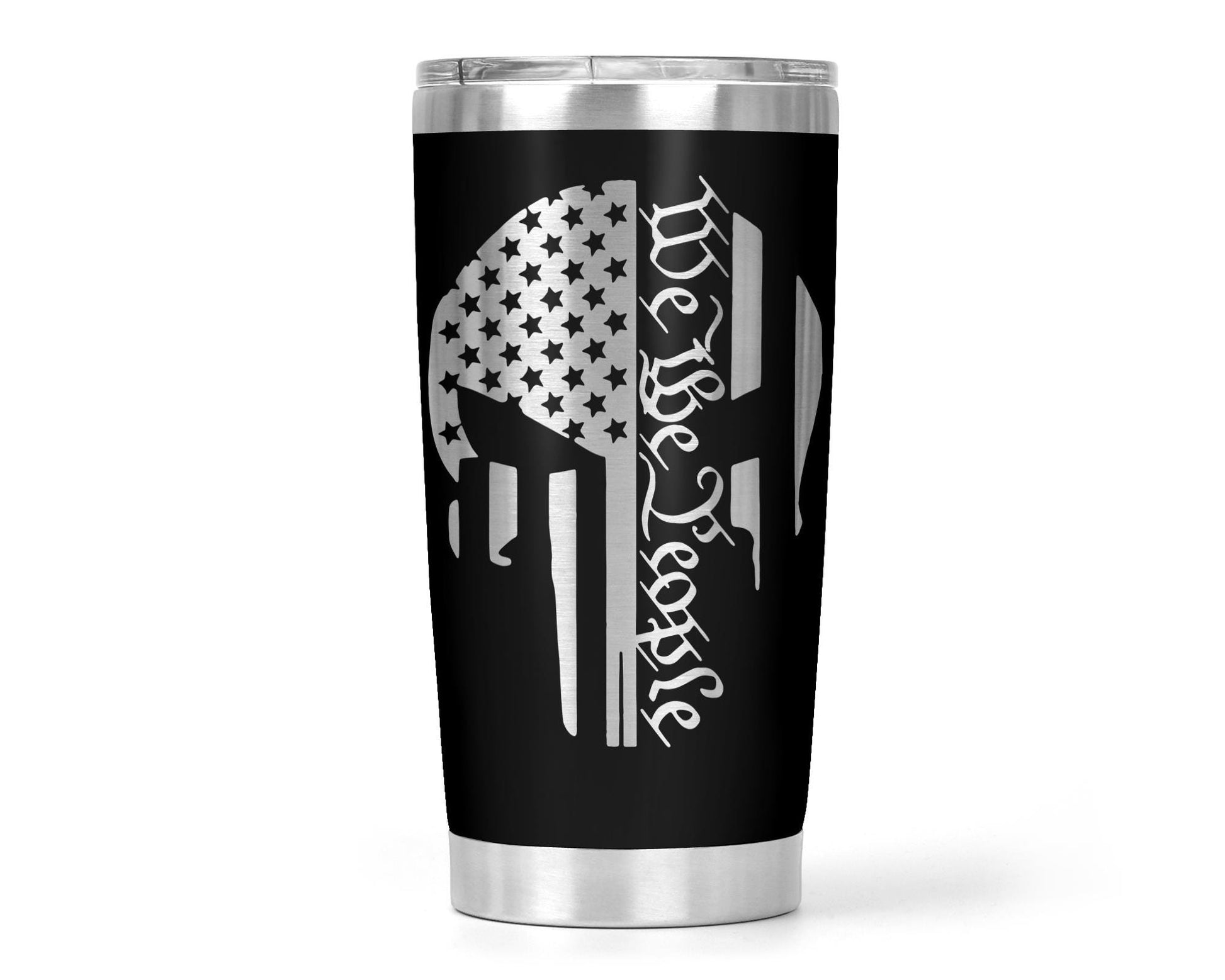 Show your unwavering patriotism and bold style with this custom engraved 20 oz tumbler, featuring a grunge American flag Punisher skull with the powerful words "We The People" embedded within the design. Crafted by a veteran-owned business, this tumbler is perfect for those who stand for freedom, resilience, and the American way.
